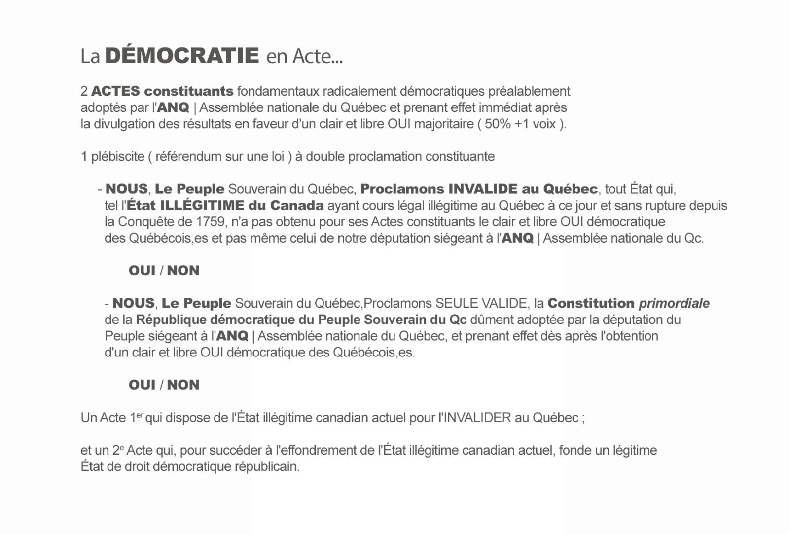 de fonder un État légitime assujetti à la volonté démocratique du peuple souverain du Québec, ce que n’est pas l’actuel État illégitime du Canada n’ayant jamais obtenu le OUI de la démocratie québécoise.